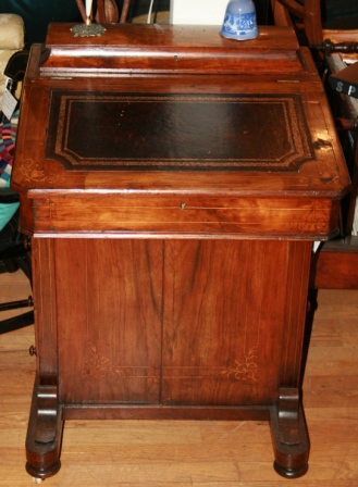Antique Captain's writing desk with stamped leather writing surface that lifts open. Four side drawers. Fine inlaid design.